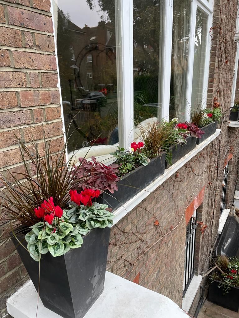 Revitalising a tired window box display with Winter interest herbaceous perennials, Heuchera, Hellebores, Uncinia, Cyclamen, Muehlenbeckia and Fern’s. #windowbox #gardenmaintenance #plants #londongardens #gardendesign #winterflowers