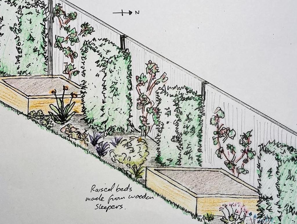 A small planting design. This includes two raised beds, constructed from 1/2 wooded sleepers for growing vegetables. #gardendesignuk #gardenmaintenance #londongardens #gardenplants #plantingdesign #planting