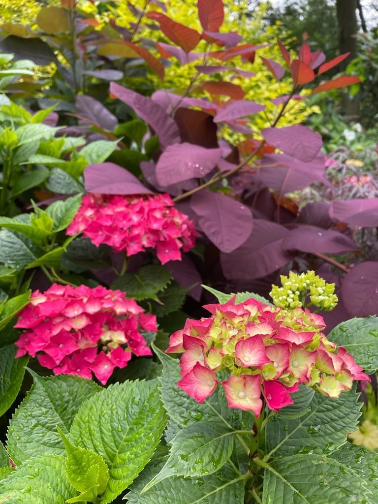 Great colour combinations with the Hydrangea, Cotinus and Sambucus giving a contrasting leaf effect #gardenplants #garden #gardenmaintenance #londongardens #plants #hydrangea #cotinus #gardendesign